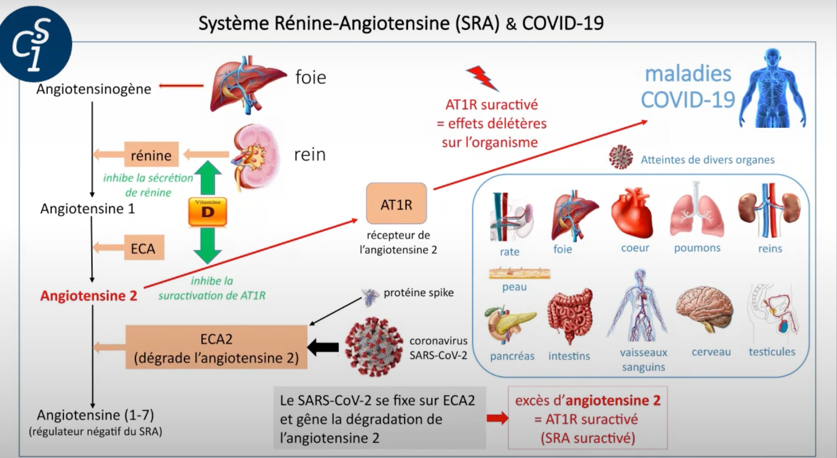 Il était logique que la protéine Spike dérègle ce système, car elle agit sur un récepteur nommé ECA2 (note: pour une description détaillée de ce mécanisme voir aussi la vidéo de l’épisode 27 du CSI avec J-M Sabatier)