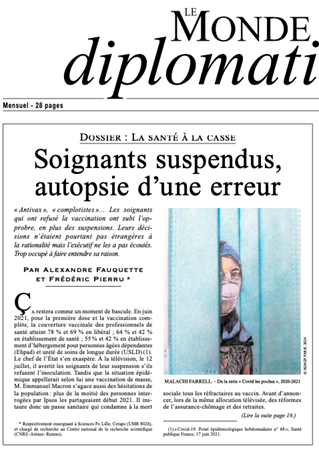 « Or souvent ces soignants voyaient juste. La plupart savaient, pour avoir été sur le pont en 2020, dans des unités Covid, que la maladie tuait prioritairement des personnes de plus de 80 ans (l’effet « moisson ») ou des gens atteints de comorbidités (obésité, diabète, hypertension, immunodépression). Ils ont aussi constaté que la vaccination vantée fin 2020 par M. Macron n’avait rien de miraculeux . Dès lors, fallait-il faire autant de dégâts humains pour un vaccin qui s’est avéré peu efficace pour empêcher la transmission d’une maladie menaçant en premier lieu la vie des plus âgés et certains malades chroniques ? Car il y a aussi eu des dommages collatéraux ; la suspension a brisé des familles et plongé des enfants dans la précarité. En tout état de cause, le président de la République a préféré politiser le vaccin et banaliser le recours à l’État d’exception plutôt que de faire de la santé publique .[9] »