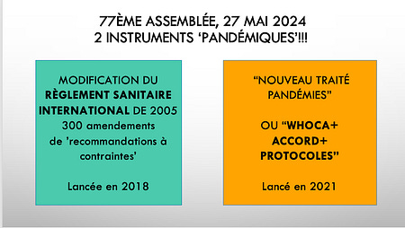 Avertissement: Lors de la 77ème Assemblée mondiale de la Santé qui se tiendra à partir du 24 mai 2024 à l’OMS à Genève, les différentes nations seront amenées à voter 2 instruments différents: une révision/des amendements au Règlement sanitaire international, le “RSI” et le Traité pandémie, formellement les “Accords et protocoles WHOCA+” Voici une série de documents pour mieux comprendre les enjeux liés à ces textes qui menacent nos libertés et notre santé. Attention 1. Ces textes sont en réécriture permanente. Les 1ère versions avaient un langage autoritaire, qui a été fortement critiqué, les versions récentes ont un langage séduisant: respect les droits humains de la souveraineté des états’ etc…Mais entre les lignes, c’est la même soupe dans un autre bol. Par ailleurs ce qui est retiré du “Traité” pourrait se retrouver dans le RSI dont les négociations ne laissent plus rien filtrer.