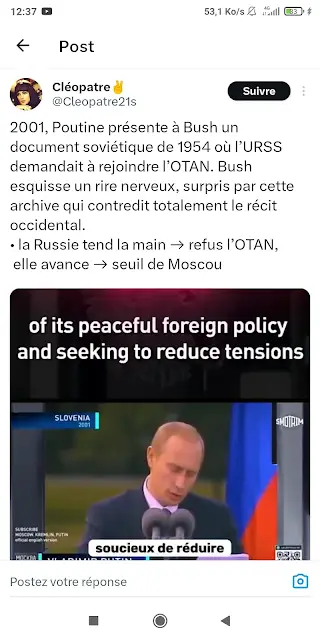 La Russie (même a l’époque soviétique) à très souvent tendu la main à l’occident, qui a toujours craché dessus. C’est, depuis le début, l’occident qui cherche la merde. Ça a même été théorisé depuis 150 ans (McKinder). Le pacte de Varsovie a été signé juste après ce refus. Source : x.com/i/status/2003193935821504775 == 2001, Poutine présente à Bush un document soviétique de 1954 où l’URSS demandait à rejoindre l’OTAN. Bush esquisse un rire nerveux, surpris par cette archive qui contredit totalement le récit occidental. • la Russie tend la main → refus l’OTAN, elle avance → seuil de Moscou Source : x.com/i/status/2002673808965329295 -- La Russie a tenté de rejoindre l'OTAN à deux reprises — Cela s'est produit en 1954, ainsi qu'en 2000 lors de la visite de Clinton. Les deux fois la Russie a essuyé un refus.