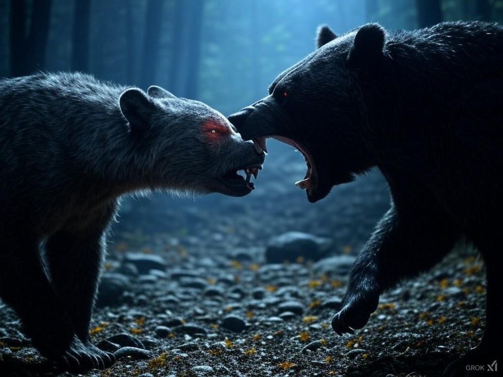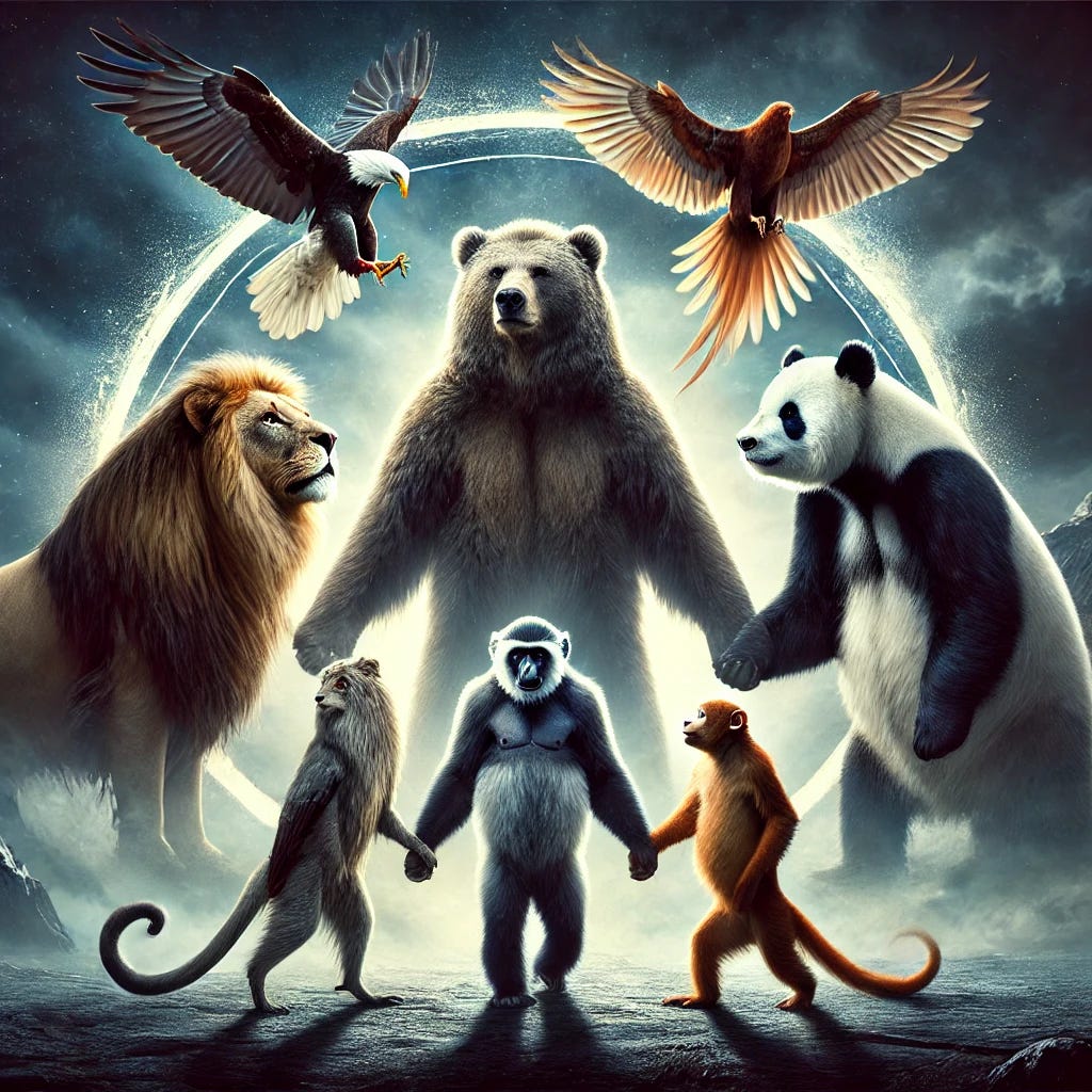 En d’autres temps, les ours n’en auraient fait qu’une bouchée. Mais au fil des siècles, ils n’avaient pas été préparés à de tels stratagèmes, ni à ces « gains de fonction » des loups et de leurs maîtres à penser. Heureusement, l’ours Ted-Poutine et le panda Xi-Yingyang avaient mis au point un plan. Pour le réaliser, ils avaient besoin du singe Chop-Elon, du faucon Ben-Saltirdaile et du lion TrrrrUmp-Grrr. Ensemble, ils espéraient sauver le monde.